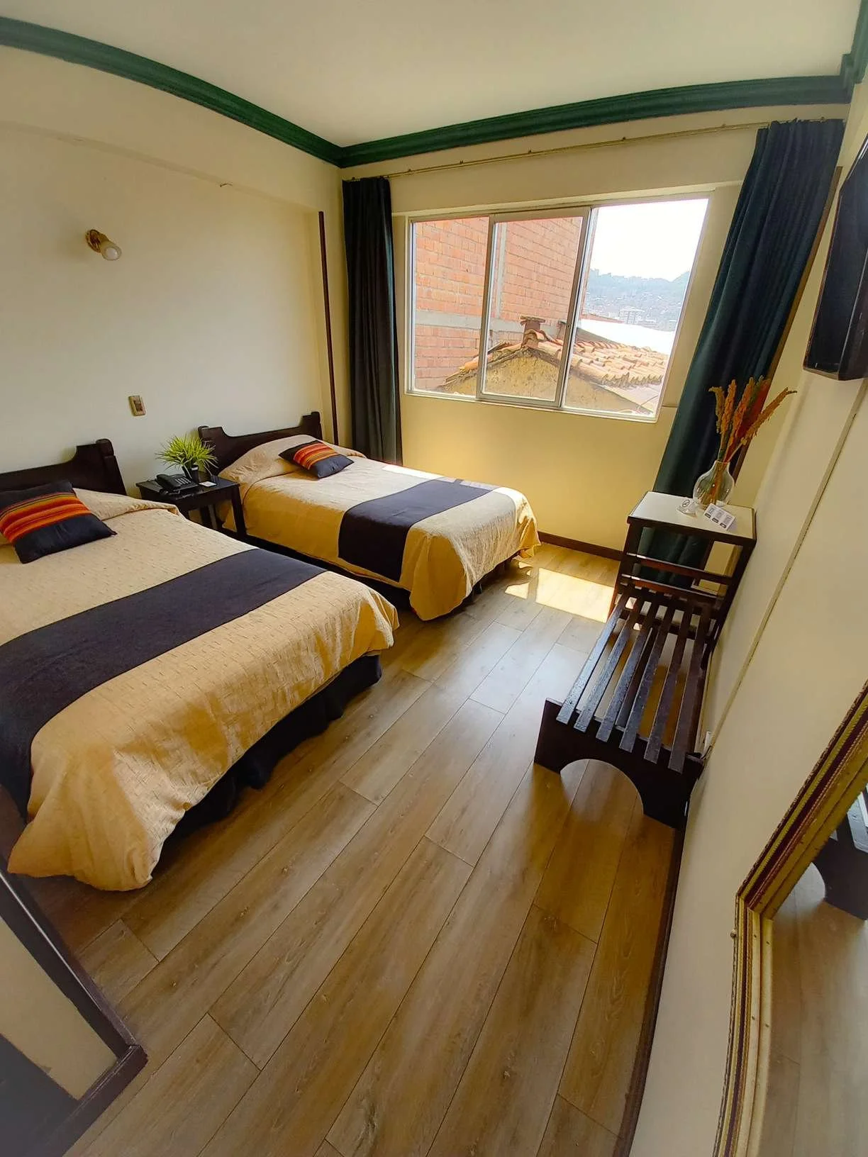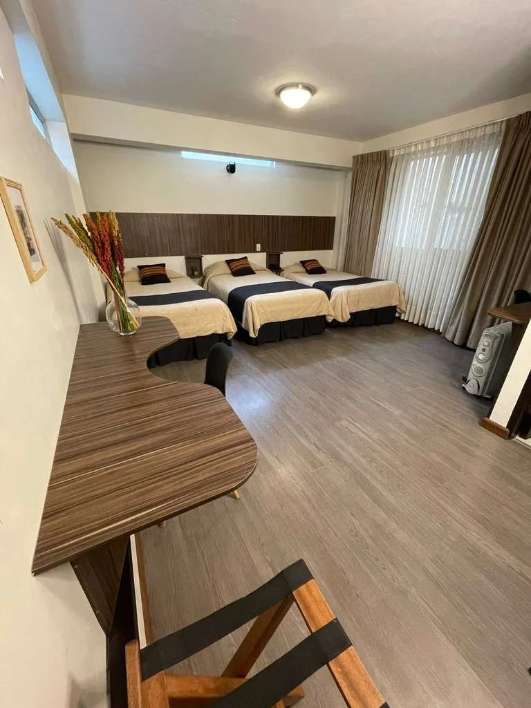 This Room Type is a 3 bed room with a convinient working area. It has a 32-inch flat screen TV with access to Cable TV (smart connection available previous request). Wifi connection is available in the room. Its bathroom has a 40-inch shower (no tub). The entire room is finished with a soft wooden like cover. Both rugged and wooden floor available as well as an Upgrade to a slightly bigger room with a marvelous City View of La Paz.